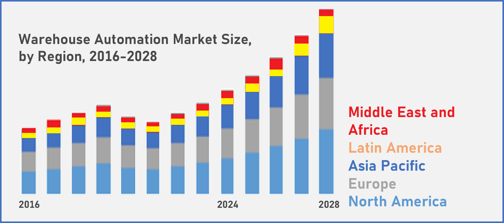- The global warehouse automation systems market was valued at USD 14 billion in 2022 and is expected to reach USD 22 billion by the end of the calendar year 2023. Based on the newest projections, this opportunity will be worth approximately USD 41 billion by 2027 and, with a minor slowdown, could further increase up to USD 47 billion by 2028, at a CAGR of roughly 16%.
