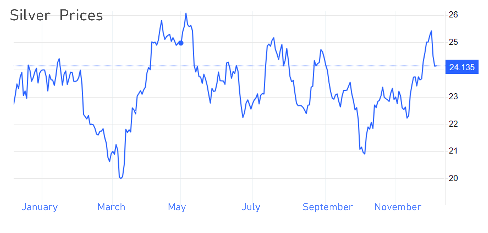 - The price of silver peaked at USD 28 in August 2020 and ended the year around USD 22.