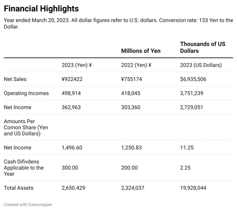 - Keyence reported record sales of USD 6.9 billion for FY23, with an operating income of USD 3.7 billion and a net income of USD 2.7 billion.