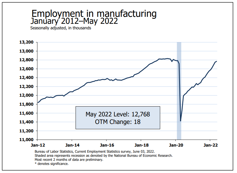 - As of early May 2022, the US recovered 1.3 million of the 1.4 million manufacturing jobs lost at the start of the pandemic in March/April 2020.