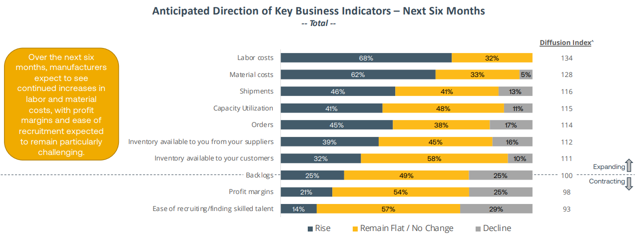 - People (headcount) issues and the difficulty in hiring additional workforce is impacting producers. 34% of the ISM survey’s respondents who are hiring indicated difficulty filling vacancies, up from 28% a month earlier.