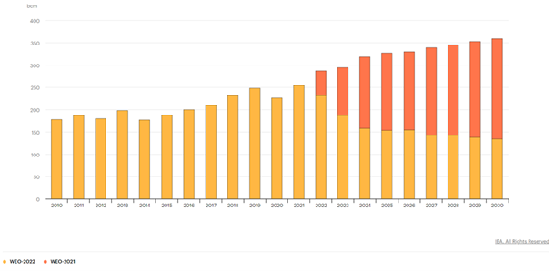 - The outlook for the rest of 2022 remains highly uncertain and will depend on the stringency of sanitary measures. Potential reform of China’s “dual control” policy, which would replace caps on total energy consumption and energy intensity with caps on total carbon emissions and carbon intensity, could trigger an increase in total demand. For 2023, over 4% demand growth is forecasted by the IEA, supported by recovery from suppressed demand in the previous year.