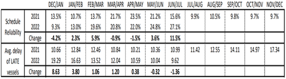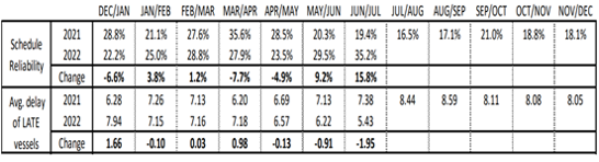 - Schedule reliability on the Asia-North America West Coast trade lane improved, increasing by 2.3 percentage points, and reached 27.1% in June and July 2022.