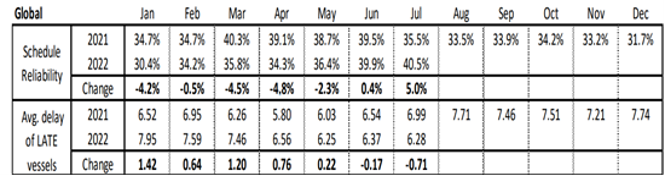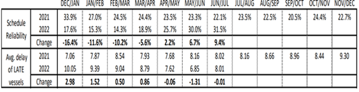 - Whilst this represents the second-lowest recorded figure for this month on the trade lane - on a year-over-year level, schedule reliability in June and July 2022 was 11.5 percentage points higher when compared with last year.