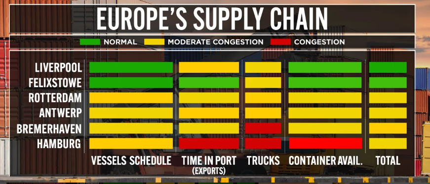 - Congestion at US ocean ports is improving however, strikes have caused disruption in Europe with difficulties experienced in Hamburg and Felixstowe.
