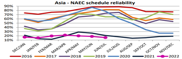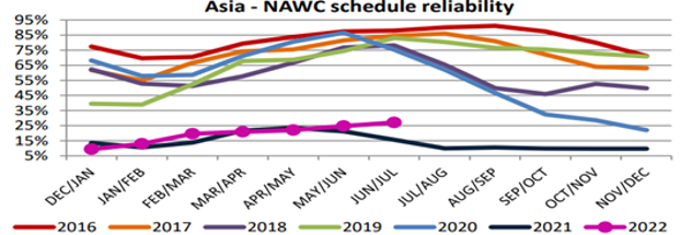 - Schedule reliability on Asia-North America East Coast continued its downwards trend, decreasing by 2.7 percentage points and reaching 15.9% in June and July 2022.