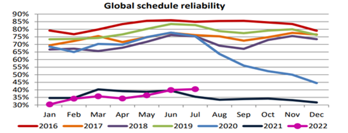 - July 2022 was the 3rd consecutive month that schedule reliability improved, although the latest increase was of a marginal 0.5 percentage points.