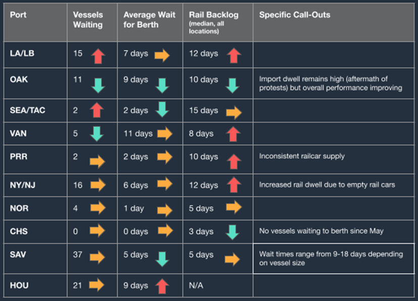 - Congestion at LA, Long Beach, and Oakland has deteriorated, in part due to strike action. Oakland is experiencing 19-day terminal dwell times and LA, Long Beach is averaging 7.9 days.