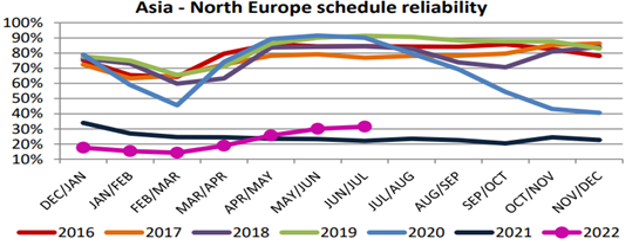 - Schedule reliability on the Asia-North Europe trade lane increased by 1.5 percentage points between June and July 2022, reaching 31.5%. This represents the second-lowest recorded figure for this month.