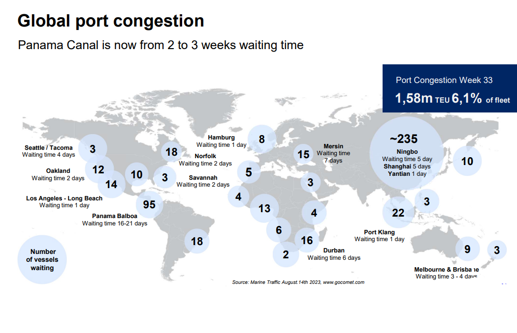 - This persisting spot rate volatility is anticipated to endure due to factors such as sailing cancellations, delayed vessel deliveries, and climate-related challenges, exemplified by the ongoing scenario at the Panama Canal where a substantial number of ships are presently queued for transit.
