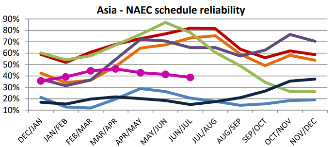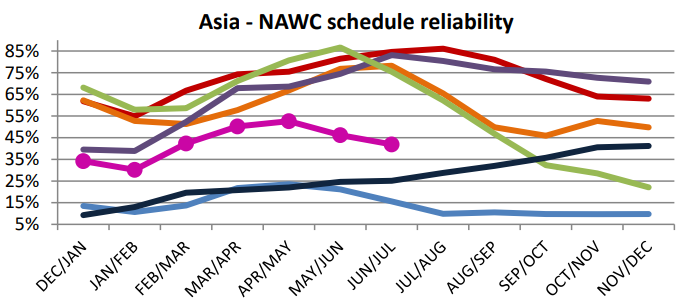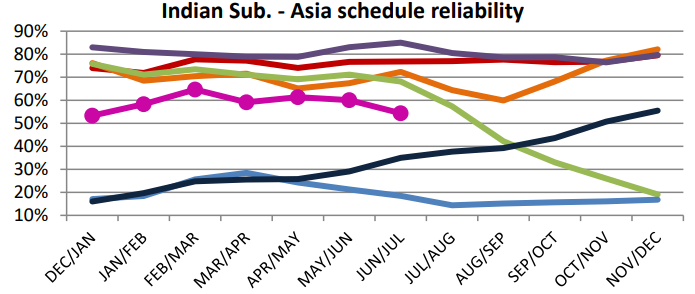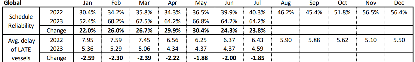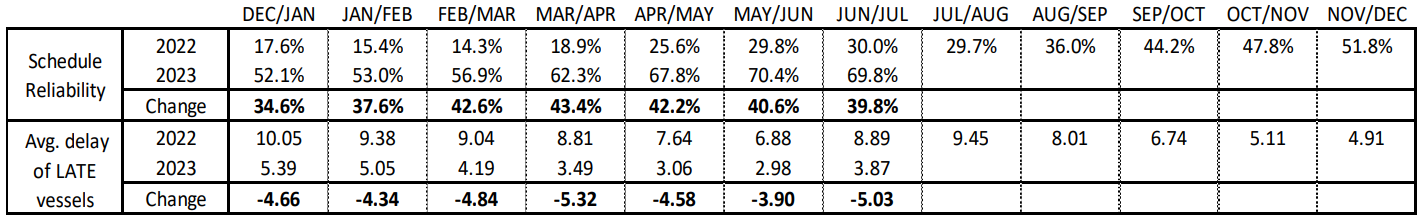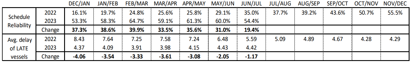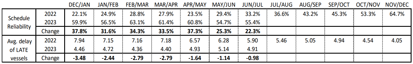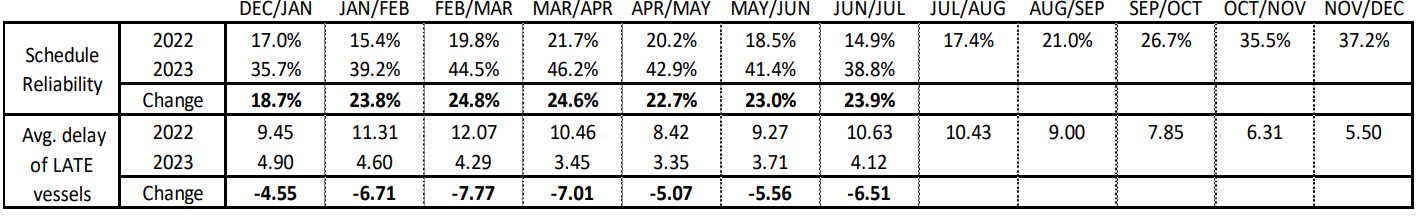 - However, on a year-on-year basis, schedule reliability in June and July 2023 is still significantly higher, up by 23.8 percentage points.