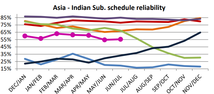 - Schedule reliability on the Asia-Indian Subcontinent trade lane increased by 0.8 percentage points from June to July 2023, reaching 55.4%.