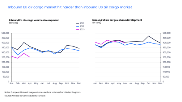 - The air cargo market, which experienced its peak in 2021-2022, has witnessed a significant decline in inbound EU cargo volumes during the first four months of 2023.