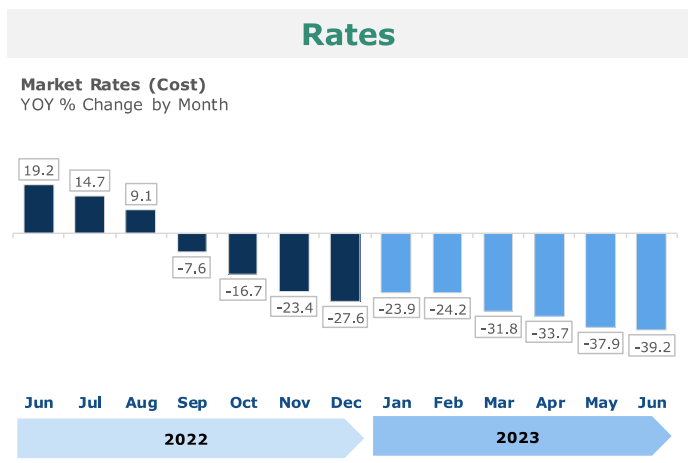 - Load posts are currently 61% lower than they were in the same period in 2022, representing nearly half of what they were in 2019.