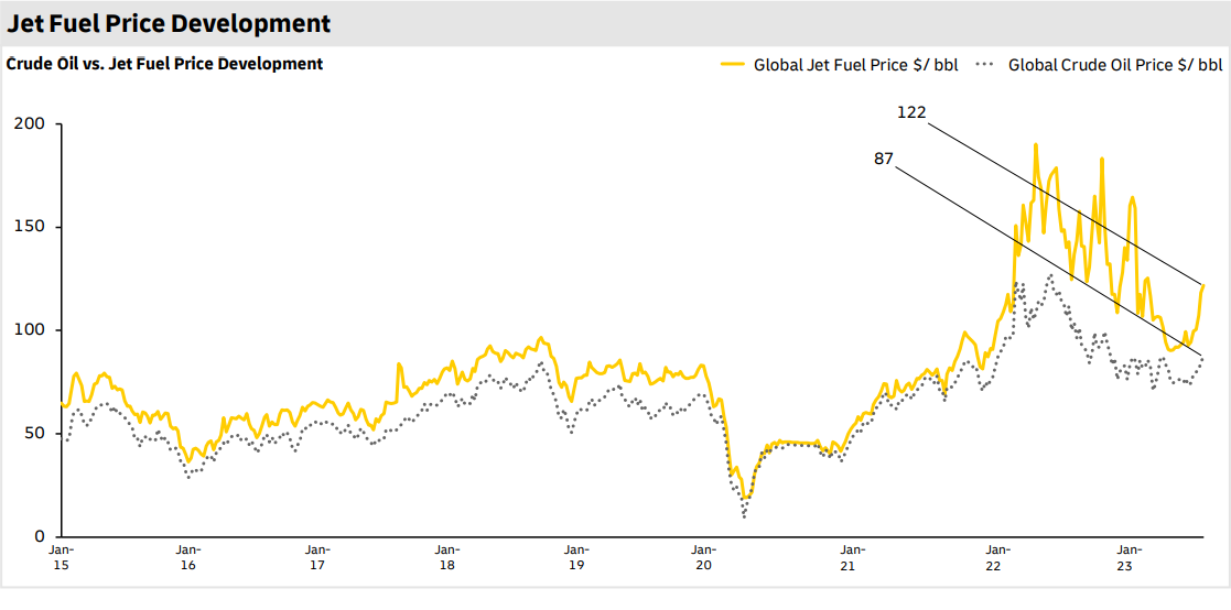 - Jet fuel prices remain high due to extended voluntary cuts in Saudi Arabia's crude oil production, with prices exceeding $100 per barrel.