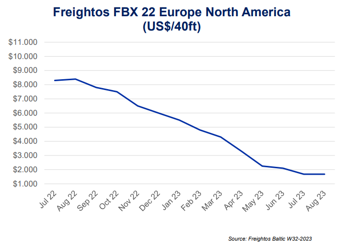 - Trans-Atlantic head-haul rates continue to decline, exhibiting a stark 77% reduction in comparison to the corresponding period of the previous year.