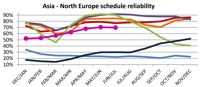 - Schedule reliability on the Asia-North Europe trade lane decreased by 0.7 percentage points from June to July 2023, reaching 69.8%.