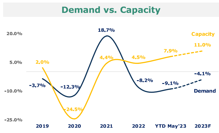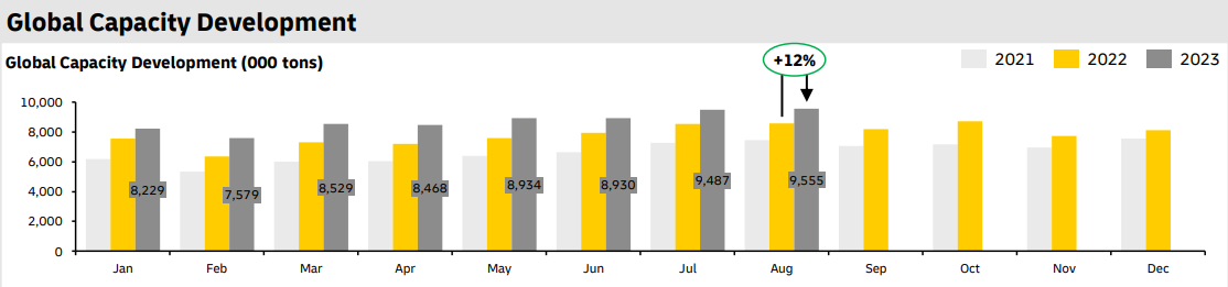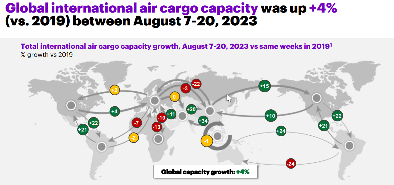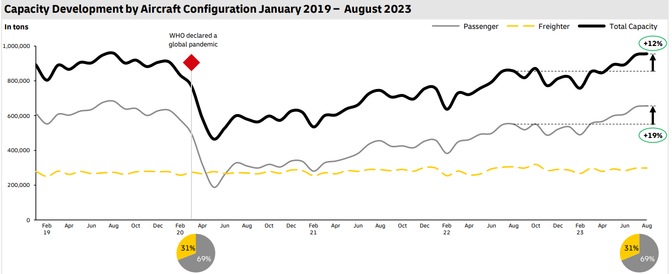 - Global capacity has increased by 12% compared to August 2022, with continuous growth in belly capacities year-on-year at approximately 19%, primarily due to strong passenger travel.