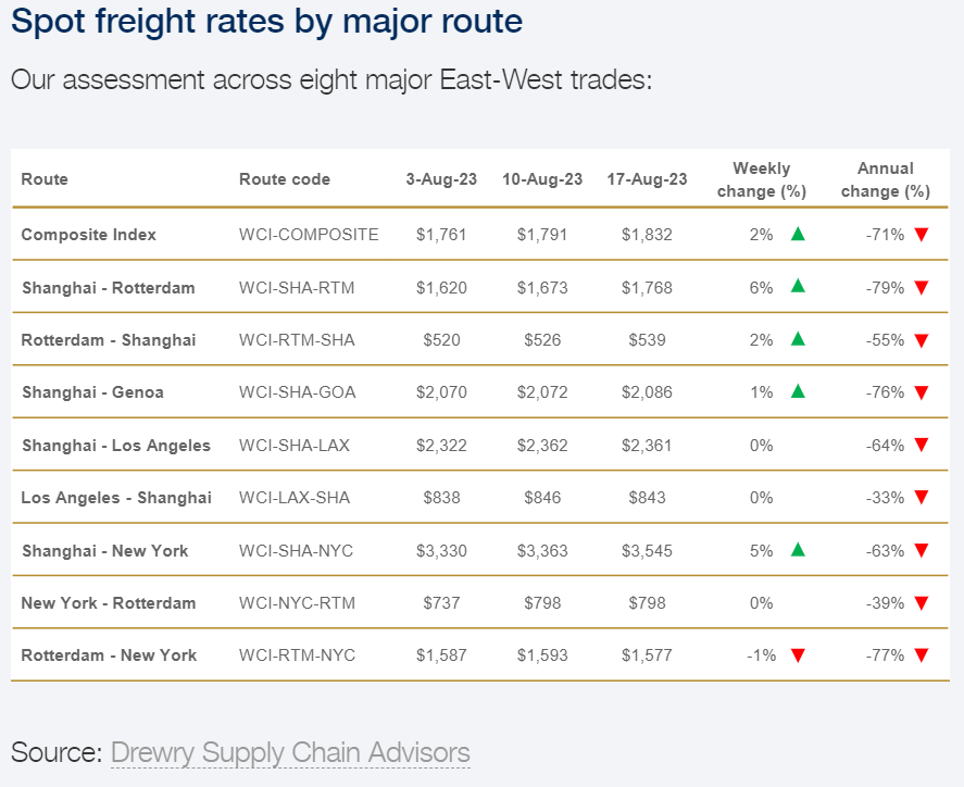 - Similarly, the Asia to Mediterranean route has seen its rates climb for the fourth successive week, resulting in a cumulative 10% increase over this interval. (See Drewry chart below)