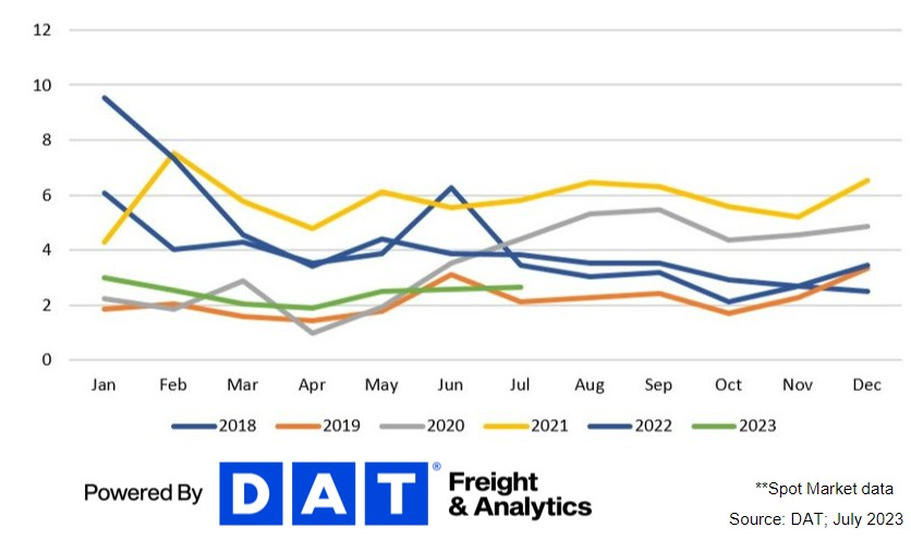 - Carriers are anticipating higher volumes in August and the coming months due to peak season but may be disappointed, leading to an excess supply situation.