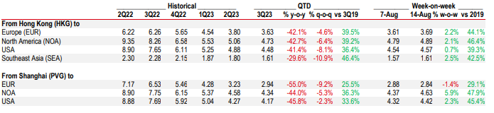 - Cathay Pacific’s cargo yields fell 51% y-o-y or 39% h-o-h in 1H23. Air cargo rates are normalizing due to the return of passenger belly capacity and a modal shift back to ocean shipping, albeit at a slower pace than container shipping.
