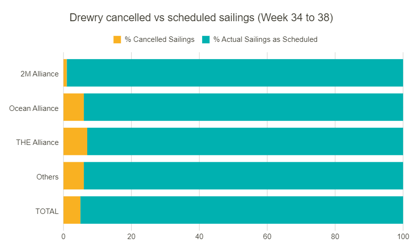 - As per Drewry Transpacific, Transatlantic, and Asia-North Europe & Med, 36 canceled sailings have been announced between weeks 34 (21 Aug-27 Aug) and week 38 (18 Sep-24 Sep), out of a total of 665 scheduled sailings, representing 5% cancellation rate.