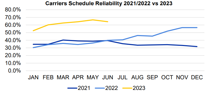 - Schedule reliability was at 64.2% in July 2023, slightly lower than the peak reached in May 2023 at 66.8%. However, it remains significantly higher year-on-year.