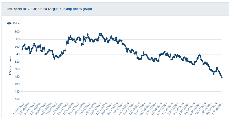 - Steel prices have fallen by 14% over the past 12 months. Steel is estimated to account for 10% of the total robot cost.