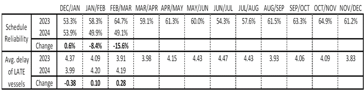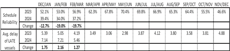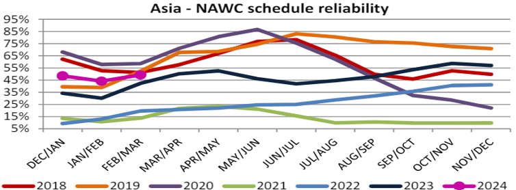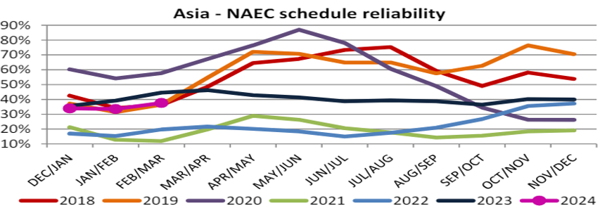 Schedule reliability on the Asia-North America East Coast increased by 4.1 percentage points M/M and reached 37.6% in February/March 2024. On a Y/Y level, schedule reliability was -6.9 percentage points lower than the 44.5% recorded at the same time last year.