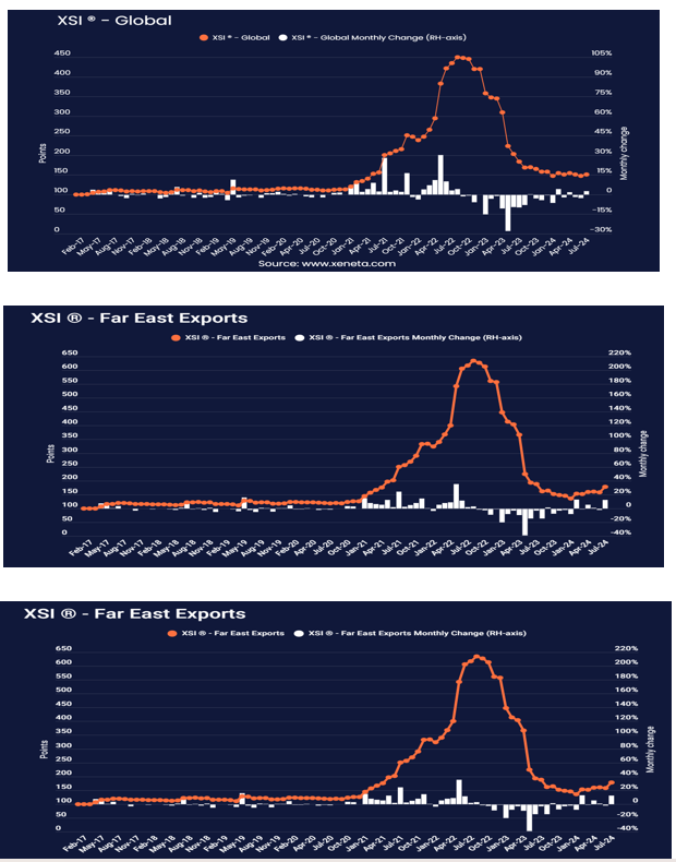Most notably, the underlying XSI® sub-index for Far East Exports, which includes the world’s biggest front haul trades to Europe and the US, increased 12.6% in July to 178.8 points. The 12.6% increase in July is slightly lower than the 13.0% increase in February, but it still leaves this sub-index at its highest since July 2023.