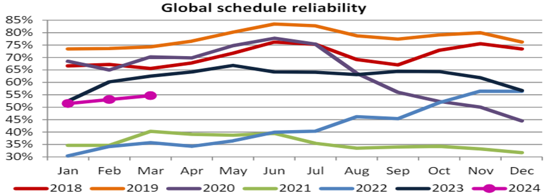 In June 2024, global schedule reliability dropped by -1.2 percentage points M/M to 54.4%, while on a YoY level, schedule reliability in June 2024 was -9.8 percentage points lower.