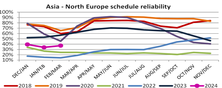 Schedule reliability on the Asia-North Europe trade lane increased by 3.2 percentage points M/M in February/March 2024 to 37.2%. On a Y/Y level, schedule reliability in February/March 2024 was lower by -19.7 percentage points compared to the 56.9% recorded at the same time last year.