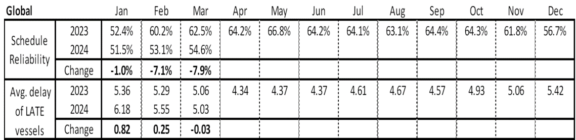 The average delay for LATE vessel arrivals also improved, decreasing by -1.75 M/M to 5.46 days in February/March 2024. On a Y/Y level, the delay was higher by 1.27 days. The average delay for ALL vessel arrivals decreased M/M by -1.18 to 3.24 days.