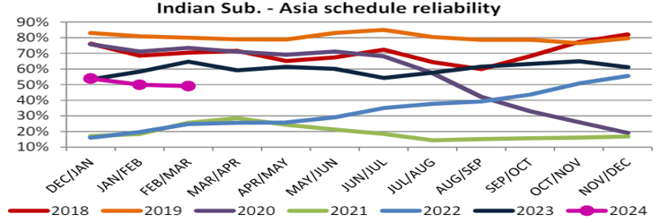 Schedule reliability on the Indian Subcontinent-Asia trade lane decreased M/M by -0.8 percentage points in February/March 2024, reaching 49.1%. On a Y/Y level, February/March 2024 schedule reliability was -15.6 percentage points lower than the 64.7% recorded at the same point in 2023.