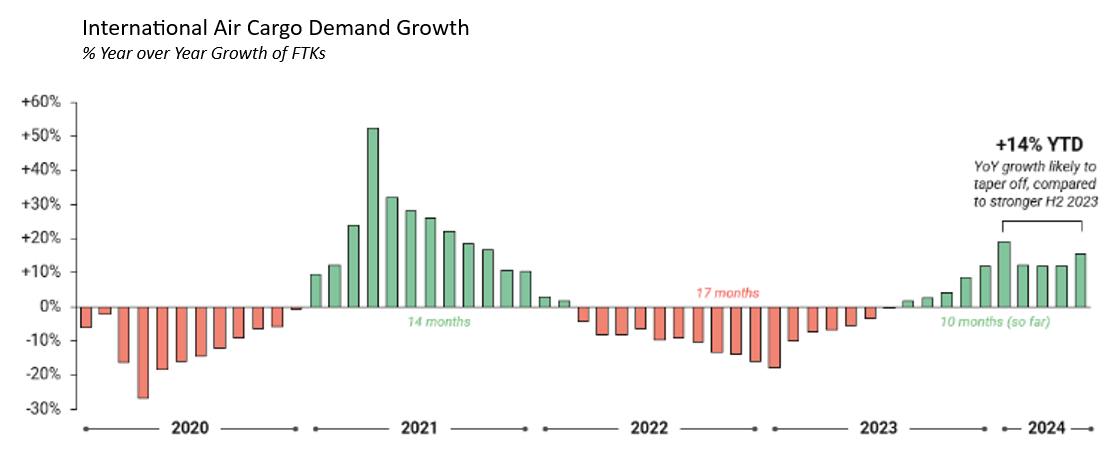 Global average air cargo spot rates have since risen by +20% year-on-year. This was again driven by strong global cargo demand growth from buoyant e-commerce demand from Asia and the comparatively low demand base in the corresponding month in 2023.