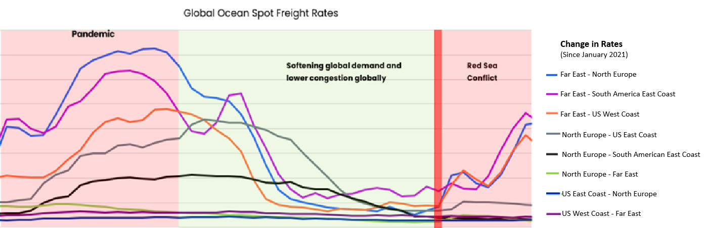The Global Freight Market remains extremely volatile, mainly due to global conflict. This has led airlines and ocean lines to reroute to avoid war zones, increasing costs and transit times.
