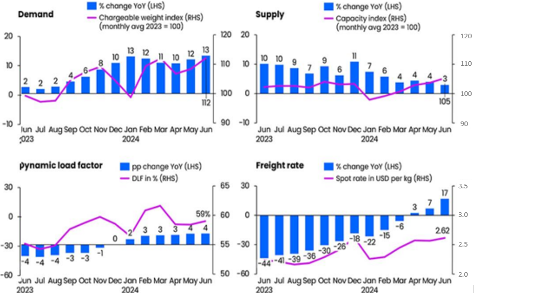 Global air cargo capacity was up 8.8% in June 2024 vs. June 2023.