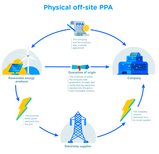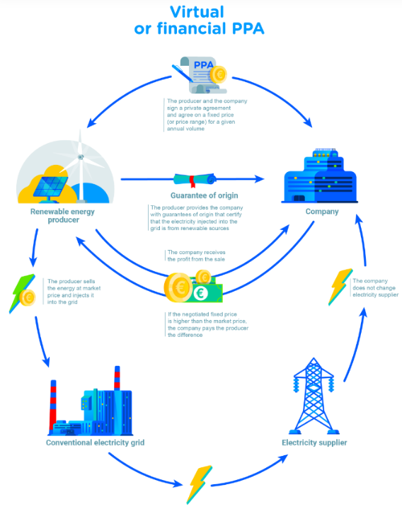 The producer and the buyer agree on a price (or price range) per kilowatt-hour for the supply of an annual volume of energy over a given period. This secures the investment, ensuring a regular income for the renewables project, but there is no physical delivery of electricity under this model. The energy produced is sold directly to the grid and the buyer benefits from the guarantees of origin associated with the production covered by the agreement. Another advantage of financial or virtual PPAs is that they come with a “contract for difference”, meaning that when the price on the highly volatile electricity market exceeds the price negotiated between the parties, the producer pays the difference to the buyer. In the opposite case, when the price per kilowatt-hour injected into the grid is below the price provided for in the contract, the buyer pays the difference to the producer. This is the most flexible type of PPA, especially when the renewable energy producer is not the customer’s electricity supplier.