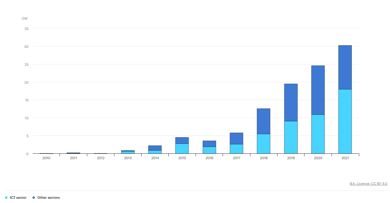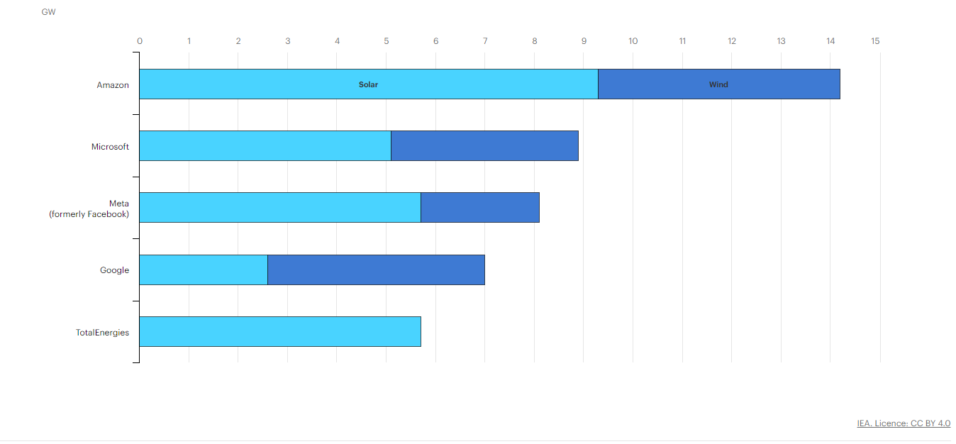 Figure 2: IEA, Top five corporate offtakers of renewable energy power purchase agreements, 2010-2021, IEA, Paris https://www.iea.org/data-and-statistics/charts/top-five-corporate-offtakers-of-renewable-energy-power-purchase-agreements-2010-2021, IEA. Licence: CC