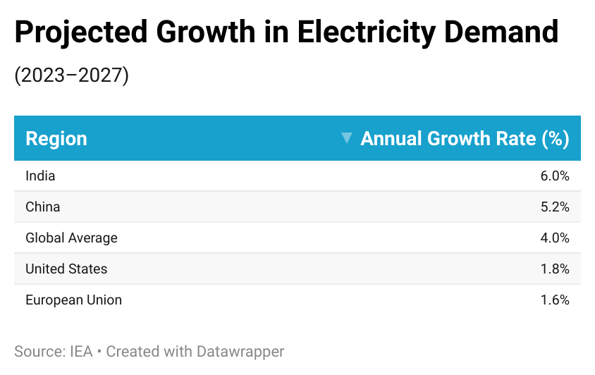Electricity Surge: A 4% annual growth through 2027 (IEA), led by China (50%+ increase) and India (10%), driven by industrial growth and cooling needs.