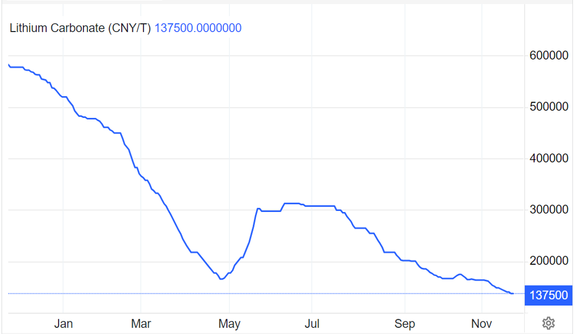 - Lithium carbonate prices extended their decline due to lower demand and steady supply.