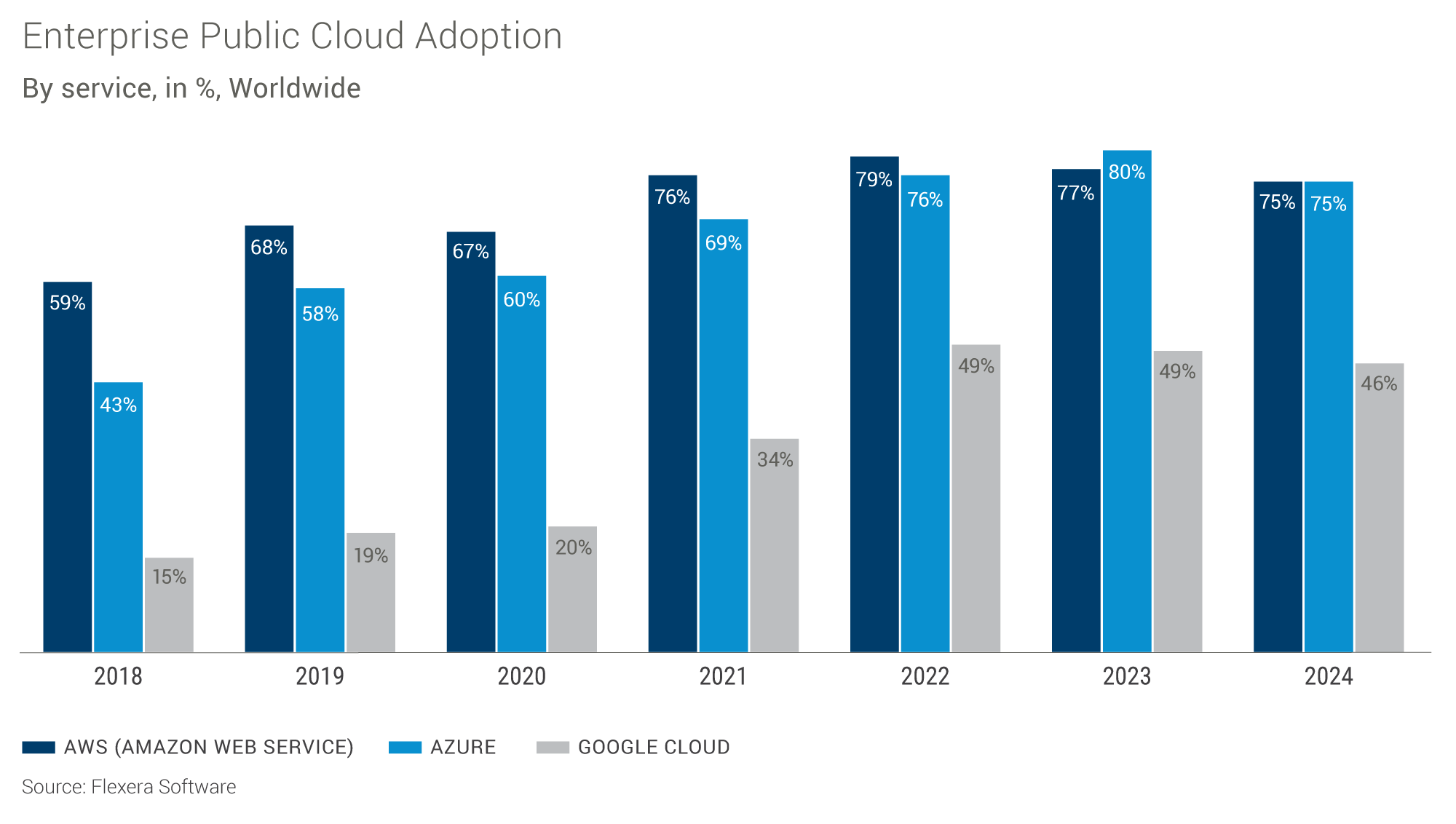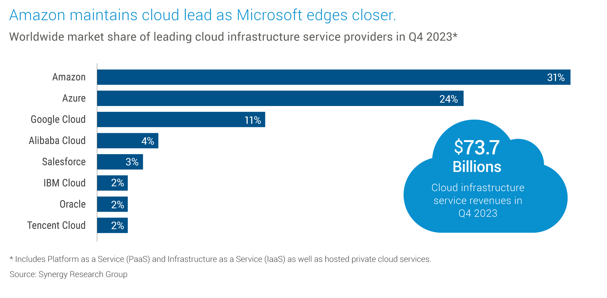- Microsoft Azure®: As a primary competitor to AWS™, Microsoft Azure® has steadily grown its market share to reach an all-time high of 24% in Q4 2023.