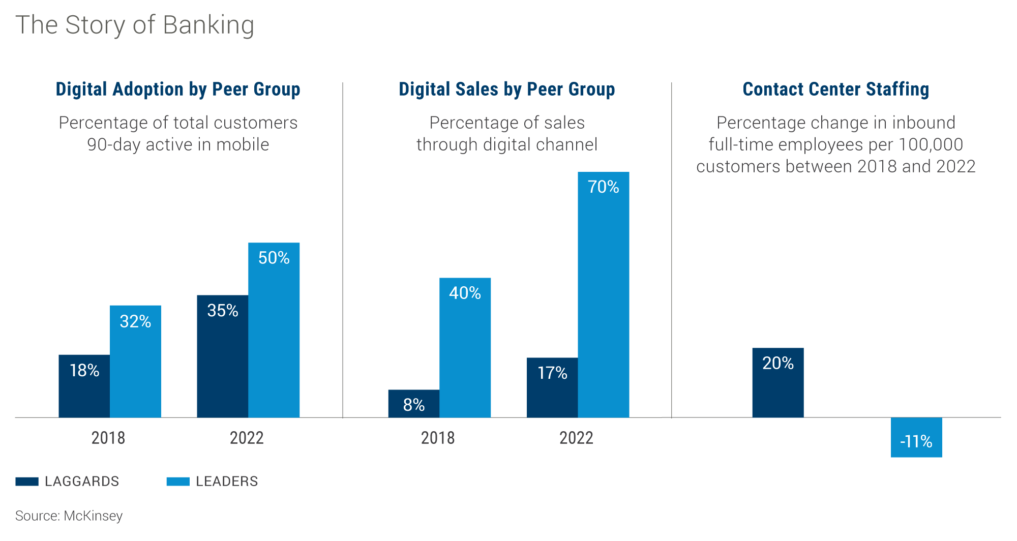 Despite the widespread adoption of digital and AI transformations by 89% of large companies globally, they have only realized 31% of the projected revenue increase and 25% of the anticipated cost savings, as reported by Harvard Business Review. Utilizing McKinsey's Finalta benchmark to monitor and analyze the performance of 80 global banks over four years, it's evident that companies at the forefront of digital transformation are generating substantially higher shareholder value than their counterparts lagging. They often achieve this by creating value that proves difficult for competitors to replicate.