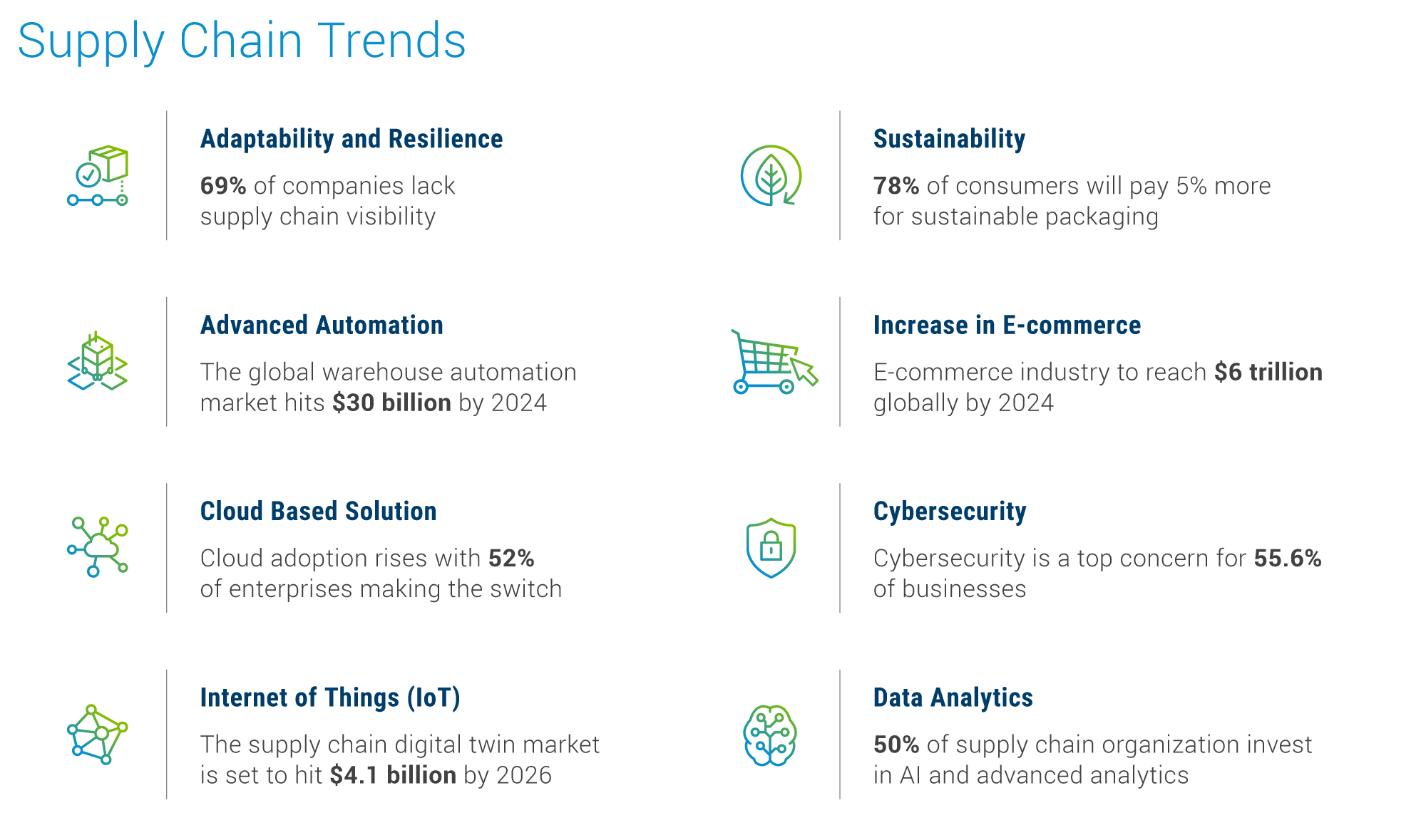 - Geopolitical tensions pose a continuing threat to supply chains, as evidenced by recent disruptions.