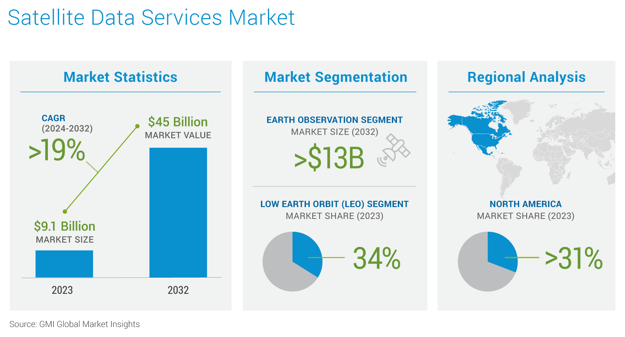 Satellite data services encompass valuable information obtained from Earth-observing satellites. These services provide a wealth of data about our planet, including imagery, environmental monitoring data, and location-based information. This data is used for various applications such as weather forecasting, environmental monitoring (e.g., deforestation tracking, pollution detection), disaster management, agriculture (e.g., crop monitoring, yield prediction), and urban planning. Satellite data services are instrumental in understanding Earth's systems, managing resources, and responding to natural disasters. They provide valuable insights for scientific research, governmental agencies, and commercial businesses, contributing to various fields and applications. According to Global Market Insights, the satellite data services market is expected to grow with a CAGR of more than 19% from 2023 to 2023. The infographic below is also derived from the same source.