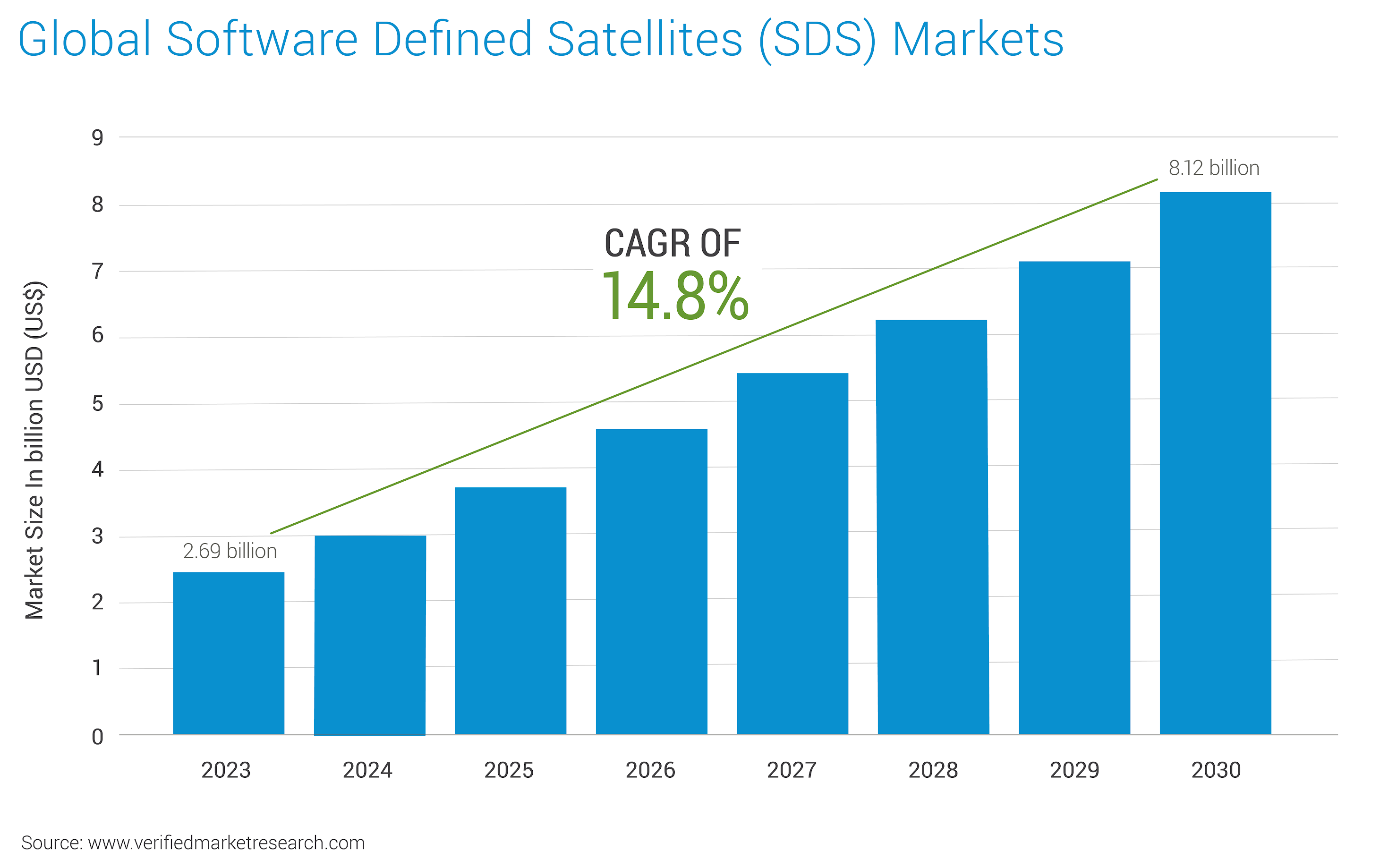 Software-defined satellite (SDS) technology represents a paradigm shift in satellite design and operation, bringing software-defined networking (SDN) flexibility and agility to space. Instead of relying on fixed, hardware-based functionalities, SDS enables satellites to be reprogrammed and reconfigured in orbit through software updates. This allows for greater adaptability, optimization, and longevity of satellite systems. According to a report published by Verified Market Research, the software-defined satellite market is expected to grow from $ 2.69Bn in 2023 to $ 8.12Bn in 2030 at a CAGR of 14.8%. The infographic below is derived from the same source.