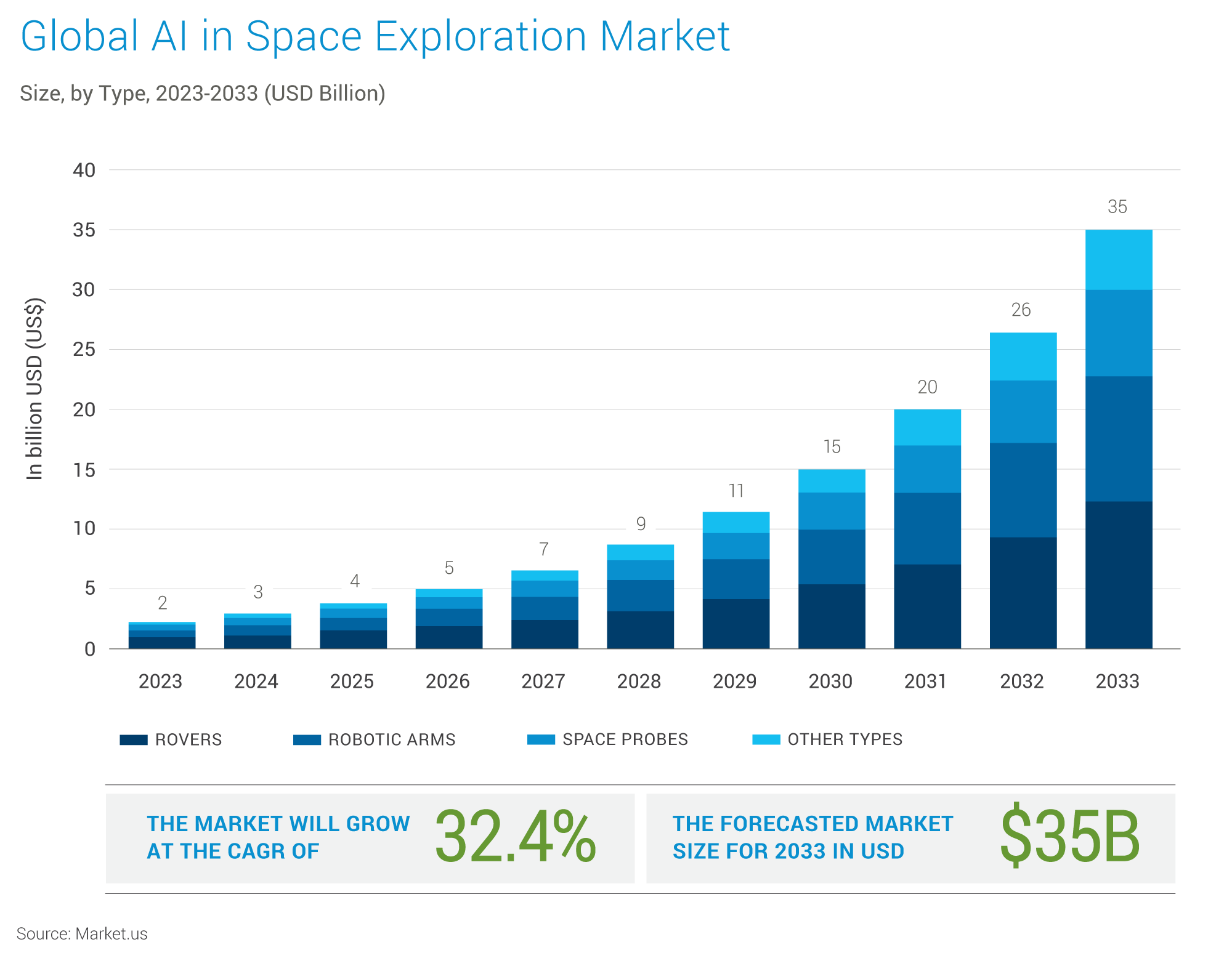 Artificial Intelligence (AI) and Machine Learning (ML) technologies are expected to play a transformative role in the evolution of SATCOM infrastructure, enhancing its efficiency, resilience, and capabilities. By leveraging the power of data analysis, automation, and intelligent decision-making, AI/ML can address many of the challenges facing the SATCOM industry and unlock new opportunities for innovation. According to Markets.us, the AI in Space Exploration market is expected to grow from ~$ 2Bn in 2023 to ~$ 35Bn in 20233. The infographic below is derived from the same source.