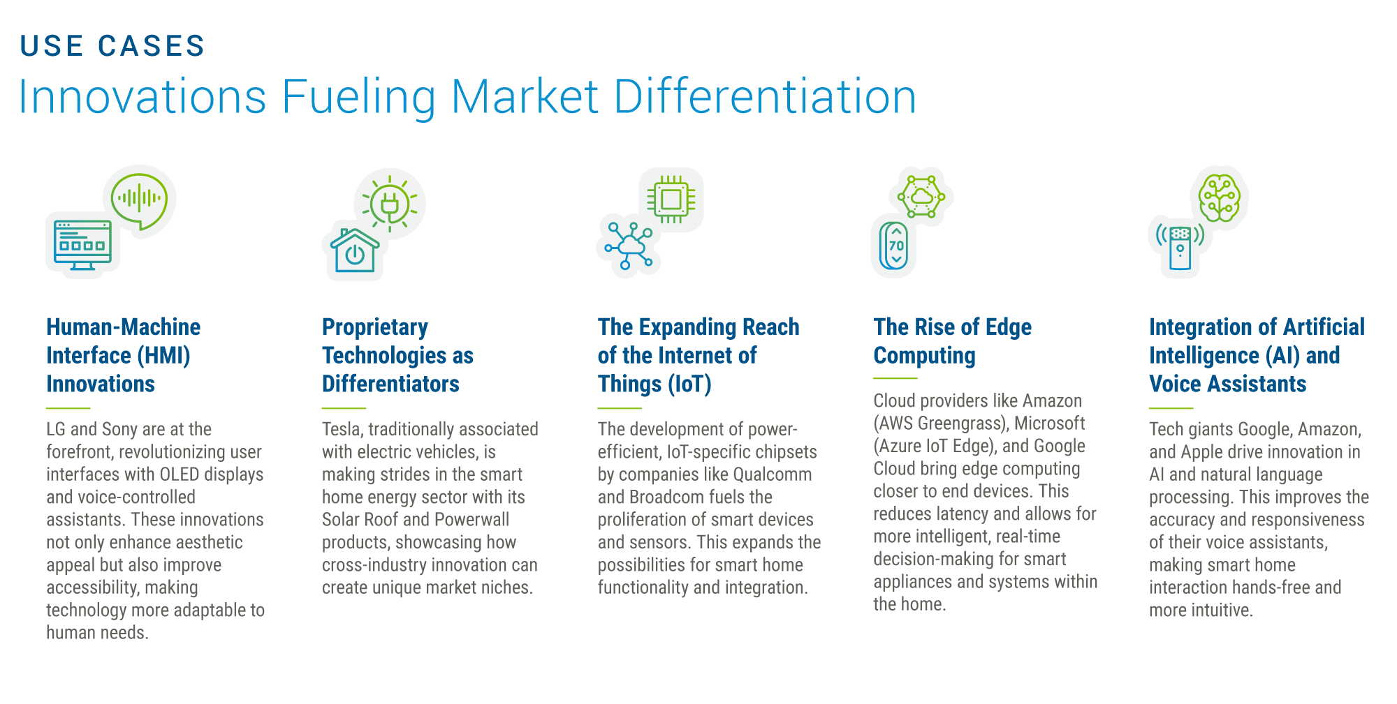 - Sustainability and ESG Focus: With a growing consumer emphasis on sustainability, companies like Philips Hue lead by example, offering energy-efficient lighting solutions and emphasizing their commitment to environmental responsibility. Further, Nest® (Google) and Ecobee leverage sensors and AI to fine-tune home climate control, offering substantial energy savings potential. Schneider Electric moves beyond single devices with whole-home energy monitoring and automation, catering to rising sustainability demands.