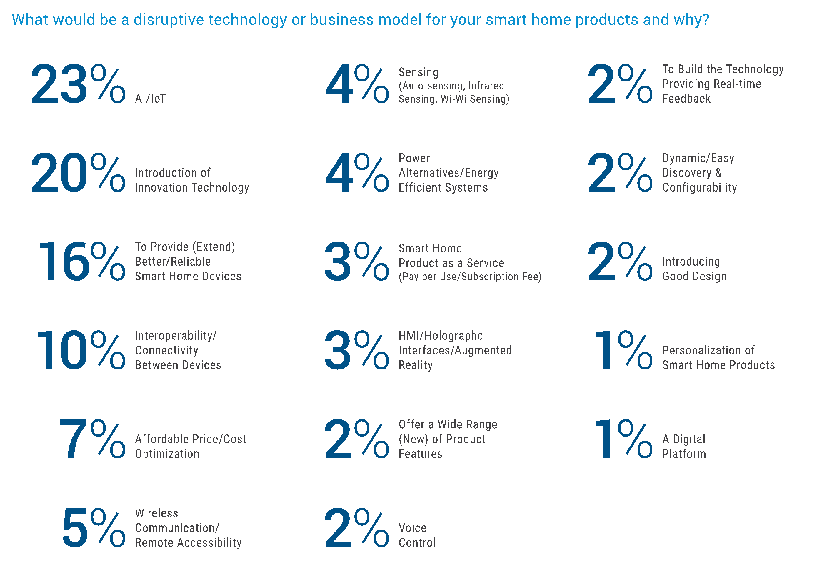 Smart home solution brands consider IoT platforms and AI (23%) as the most significant disruptive technologies to their product development, per a Survey on ‘Smart Homes Technology Trends’ sponsored by Jabil. The survey was conducted among 200+ decision-makers at the smart home device and appliance OEMs. For brands, “disruptive” business models involve interoperability — products connect seamlessly within an existing smart home to increase ease of use and accessibility for consumers — as well as cost optimization strategies to increase consumer adoption. “AI will be our disruptive technology as AI will help collect data from home automation devices, predict user behavior, provide maintenance data, [and] help enhance data security and privacy,” said one respondent. Regarding connectivity, developers want to “improve product interoperability standards, which will help win more customers.” “The biggest [disruptor] would be in ease of connection and set up,” adds another. “We see many connected products sold that the customer never connects.”