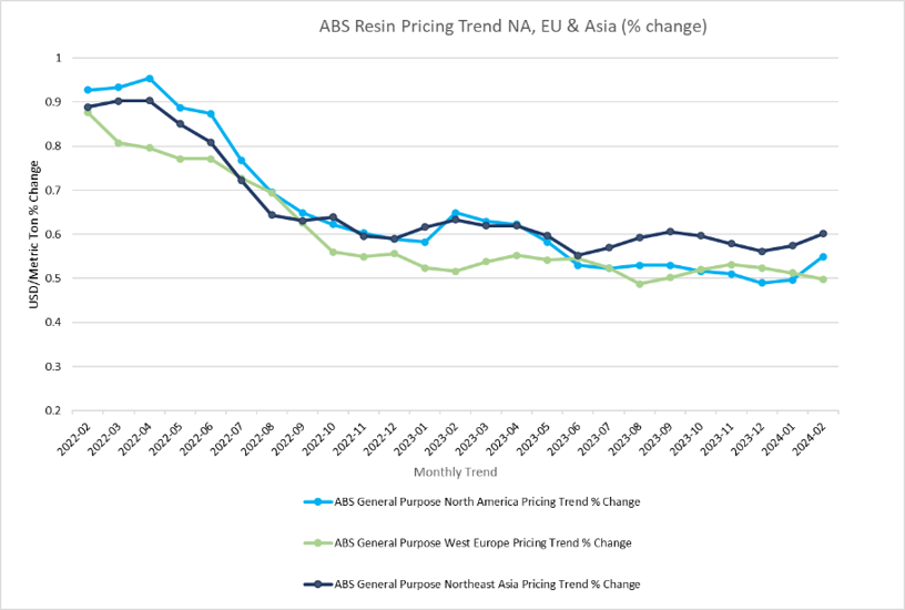 - North American ABS pricing is trending upward as producers cite raw material increases of Butadiene and Styrene monomers.